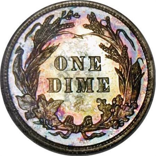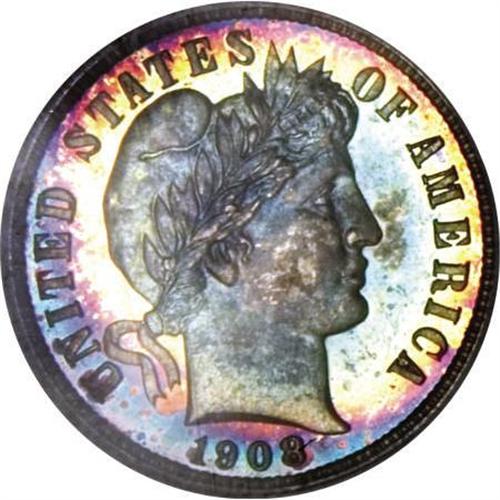 <B>1908 10C PR67 </B></I><img src="/images/star.gif" width="10" height="10" alt="" border="0"><B> NGC.</B></I> Concentric target toning on each side ranges from turquoise-green at the centers to deep magenta and electric-blue near the rims, confirming the NGC <B><img src="/images/star.gif" width="10" height="10" alt="" border="0"></B></I> designation. A series of horizontal lines on the cheek appear to be light roller marks (as made), that are barely visible beneath the gorgeous, deep patina. Extensive scrutiny under a loupe fails to reveal any sign of visible contact. <BR><BR><B>Coin Engraver:</B> Charles E. Barber<BR><BR><b>Shipping:</b> Coins & Currency (<a target="_blank" href="http://www.heritageauctions.com/common/shipping.php">view shipping information</a>)