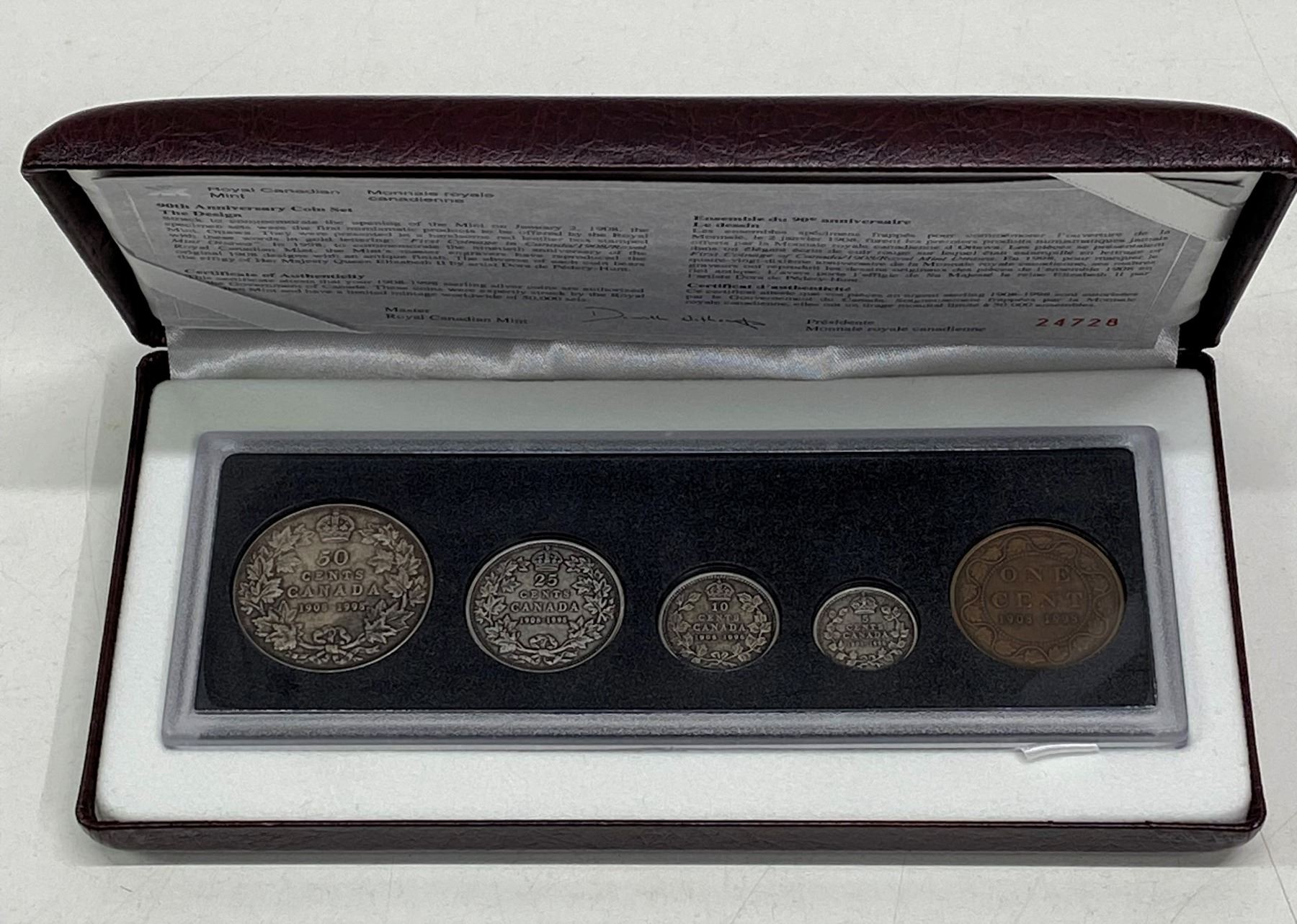 1908 – 1998 Antique Finish Coin Set. As issued by the Royal Canadian Mint to commemorate the 100th Anniversary of the Mint in Ottawa. Large Cent does not have the word CANADA on it. Housed in its original case of issue.
