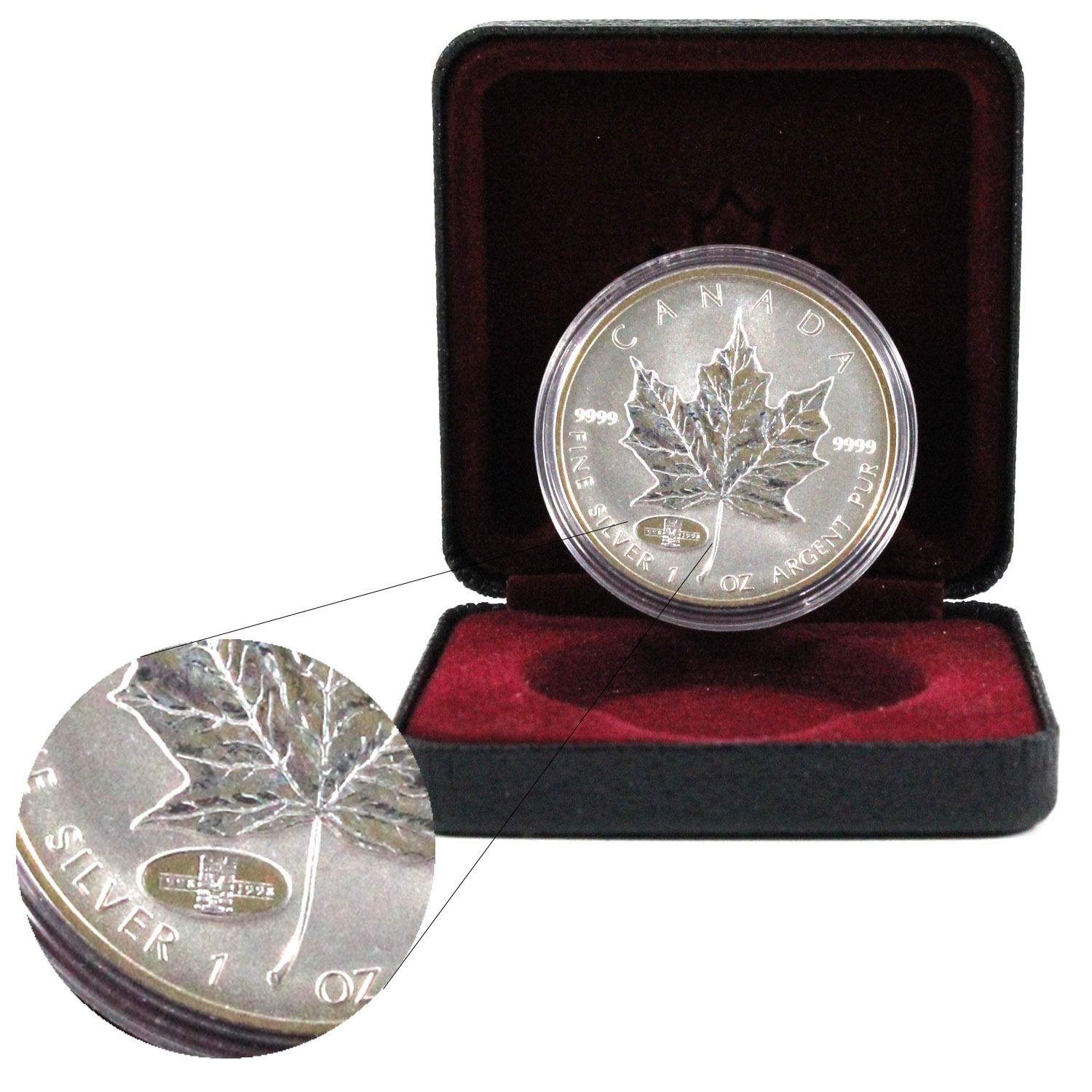 1908-1998 Canada 1oz 100th Anniversary of the RCM Privy Mark .9999 Fine Silver Maple Leaf Encapsulated in Black Display Box (Capsule lightly scuffed). TAX Exempt