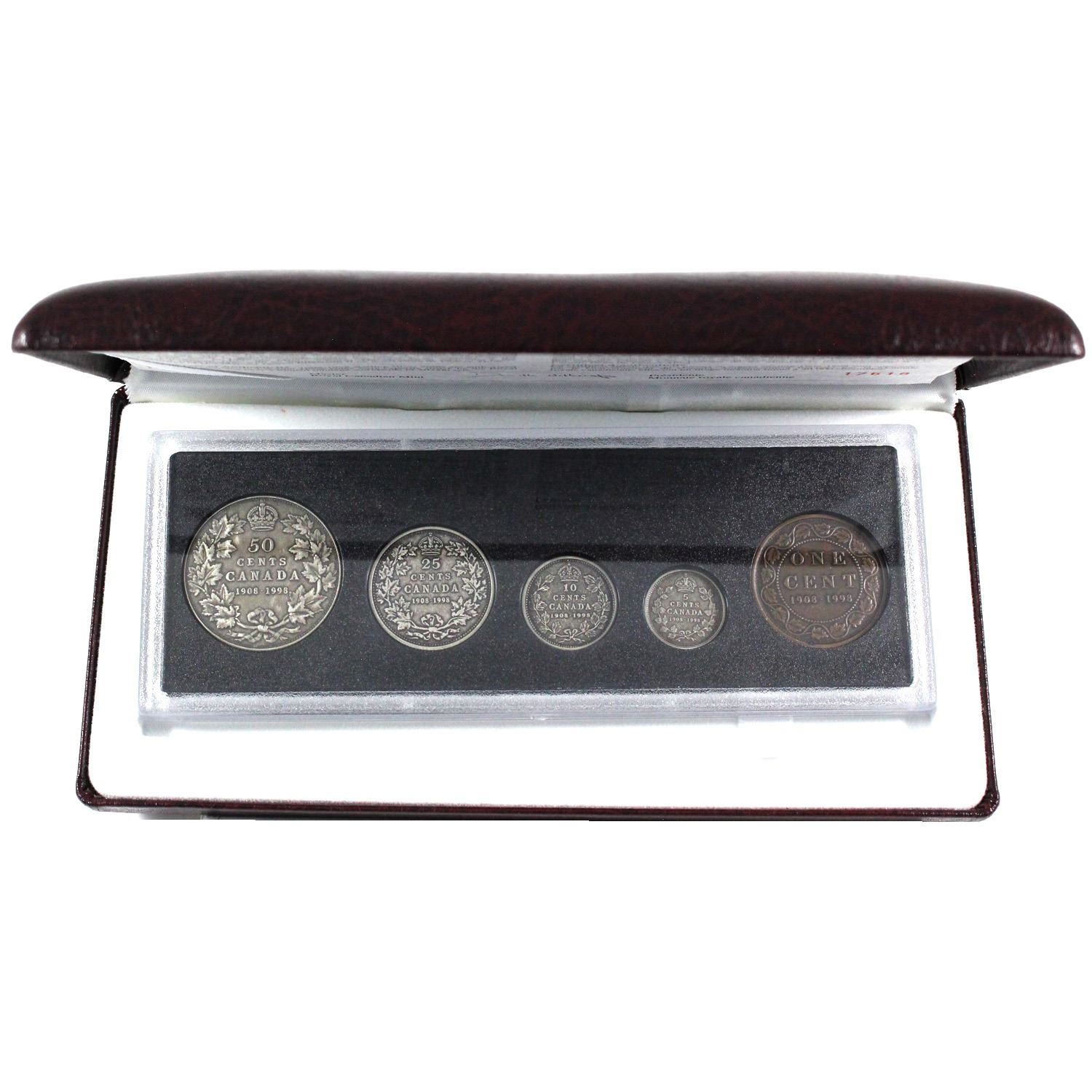1908-1998 Canada Commemorative Sterling Silver Antiqued Proof Set in Hard Plastic and Maroon RCM Display Case with COA (5-cent lightly toned).