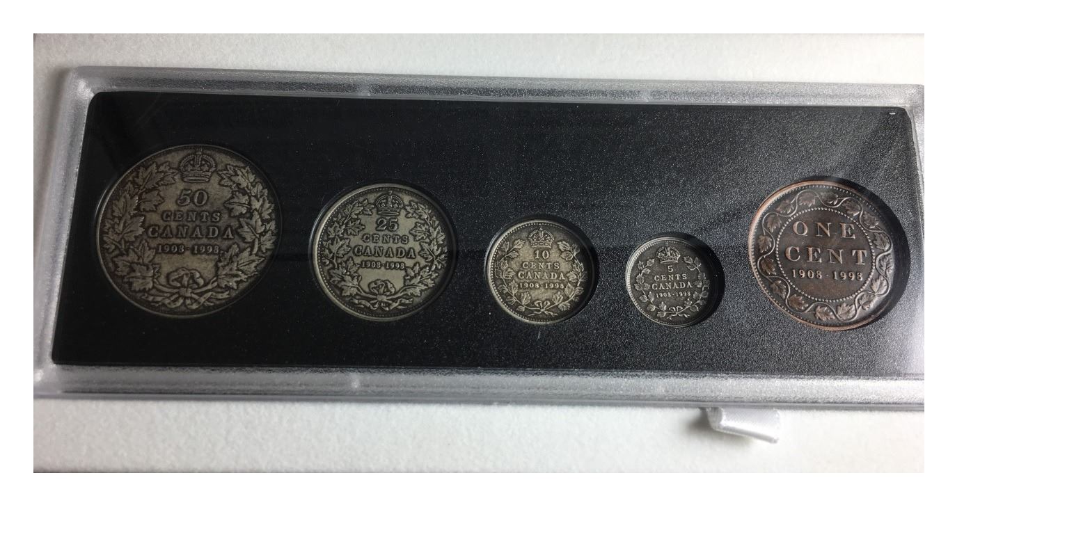 Issued to commemorate the 90th Anniversary of the Royal Canadian Mint, this five coin set features the same reverse designs as the original 1908 coins, except for the double date 1908-1998. This set is issued in matte finish.