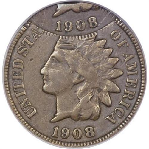 <B>1908 1C Indian Cent--Double Struck, Second Strike 80% Off Center with Indent--VF30 PCGS.</B></I> This cent remained in the coin chamber after its initial, normal blow from the dies. It was struck a second time, far off center toward 12 o'clock, at 12 o'clock relative to the first strike. A planchet (not included) was fed in for the second strike, between the obverse die and the present coin. This planchet caused a small obverse indent visible at 12 o'clock.<BR><BR><B>Coin Engraver:</B> James B. Longacre<BR><BR><b>Shipping:</b> Coins & Currency (<a target="_blank" href="http://www.heritageauctions.com/common/shipping.php">view shipping information</a>)