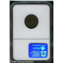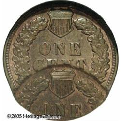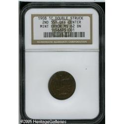 <B>1908 1C Indian Cent--Double Strike, Second Strike 55% Off Center--MS62 Brown NGC.</B></I> The second strike is off-center at 12:30, yielding two complete dates. Regrettably, the position of the two strikes does not allow viewing of the mintmark area, thus we cannot be certain if this was struck in Philadelphia or San Francisco. A faint die line connects the top of the T in UNITED to the border, almost exactly above the left edge of the upright of that letter. If a normally struck example could be located with this same die line, it may help in making a geographical determination. The general appearance is reminiscent of Philadelphia Mint issues, as it does not display the usual "woodgrain" texture of the San Francisco Mint issues. The surfaces are olive-brown with faded orange color and iridescent toning. Lot:10837