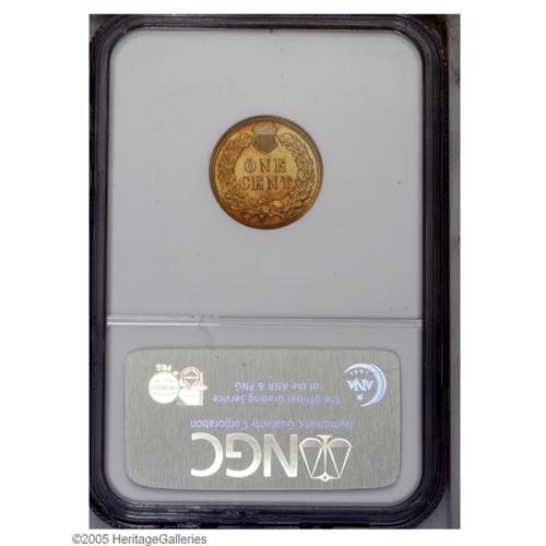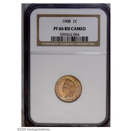 <B>1908<1C> PR66 Red Cameo NGC.</B></I> Consistent peach color consumes the obverse, while the reverse displays lovely gold and brick-red hues. A needle-sharp and deeply reflective premium Gem. The devices exhibit prominent contrast, and only a couple of nearly microscopic carbon flecks and fully retained laminations deny perfection. As of (9/05), the only proof 1908 Cent certified as Red Cameo by NGC.