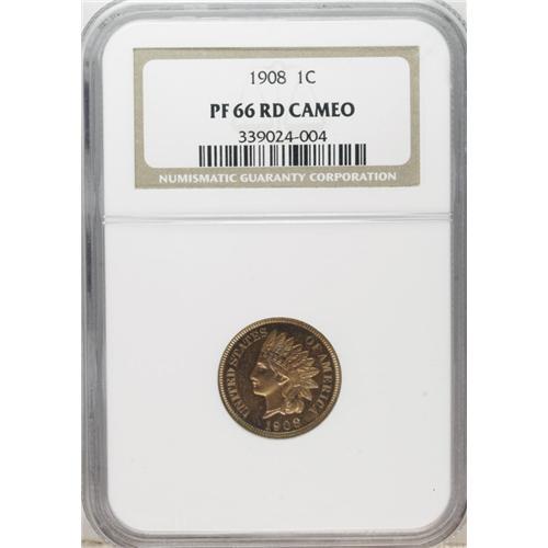 <B>1908 1C PR66 Red Cameo NGC.</B></I> Consistent peach color consumes the obverse, while the reverse displays lovely gold and brick-red hues. A needle-sharp and deeply reflective premium Gem. The devices exhibit prominent contrast with the mirrored fields, and only a couple of nearly microscopic carbon flecks deny perfection.<BR><BR><b>Shipping:</b> Coins & Currency (<a target="_blank" href="http://www.heritageauctions.com/common/shipping.php">view shipping information</a>)