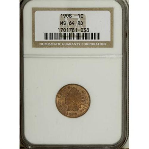 <B>1908 1C MS64 Red NGC.</B></I> NGC Census: (183/170). PCGS Population (363/257). Mintage: 32,327,988. Numismedia Wsl. Price for NGC/PCGS coin in MS64: $142. (#2231)<BR><BR><B>Coin Engraver:</B> James B. Longacre<BR><BR><b>Shipping:</b> Coins & Currency (<a target="_blank" href="http://www.heritageauctions.com/common/shipping.php">view shipping information</a>\)