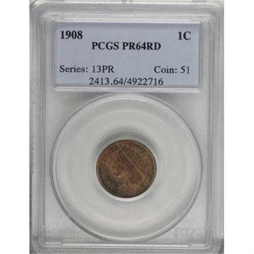 <B>1908 1C PR64 Red PCGS.</B></I> PCGS Population (37/39). NGC Census: (13/34). Mintage: 1,620. Numismedia Wsl. Price for NGC/PCGS coin in PR64: $376. (#2413)<BR><BR><B>Coin Engraver:</B> James B. Longacre<BR><BR><b>Shipping:</b> Coins & Currency (<a target="_blank" href="http://www.heritageauctions.com/common/shipping.php">view shipping information</a>)