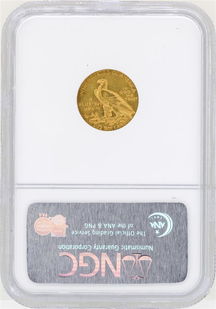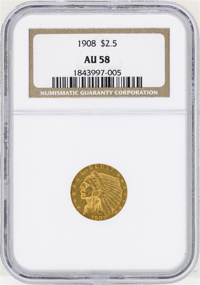 One 1908 $2 1/2 Indian Head Quarter Eagle Gold Coin NGC AU58. NGC Certified.