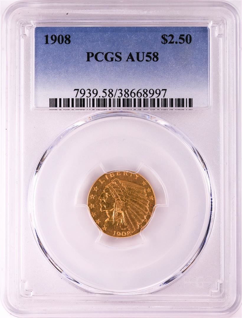 One 1908 $2 1/2 Indian Head Quarter Eagle Gold Coin PCGS AU58. PCGS Graded.