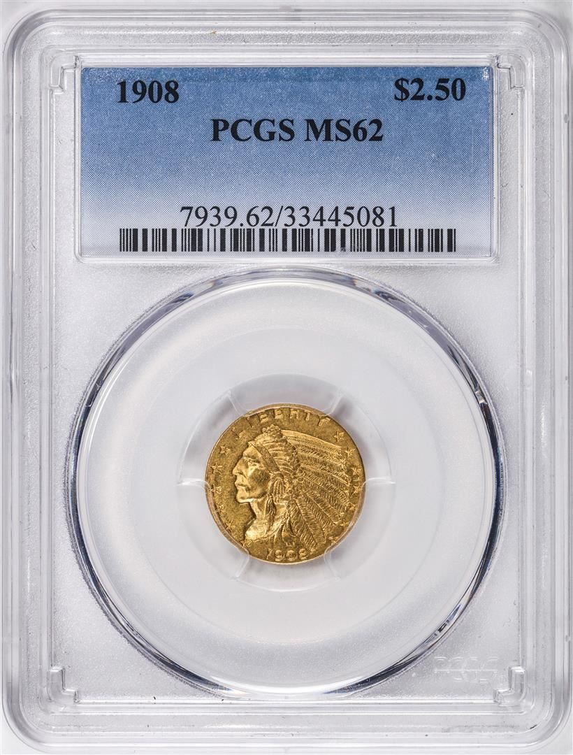 One 1908 $2 1/2 Indian Head Quarter Eagle Gold Coin PCGS MS62. PCGS Graded.