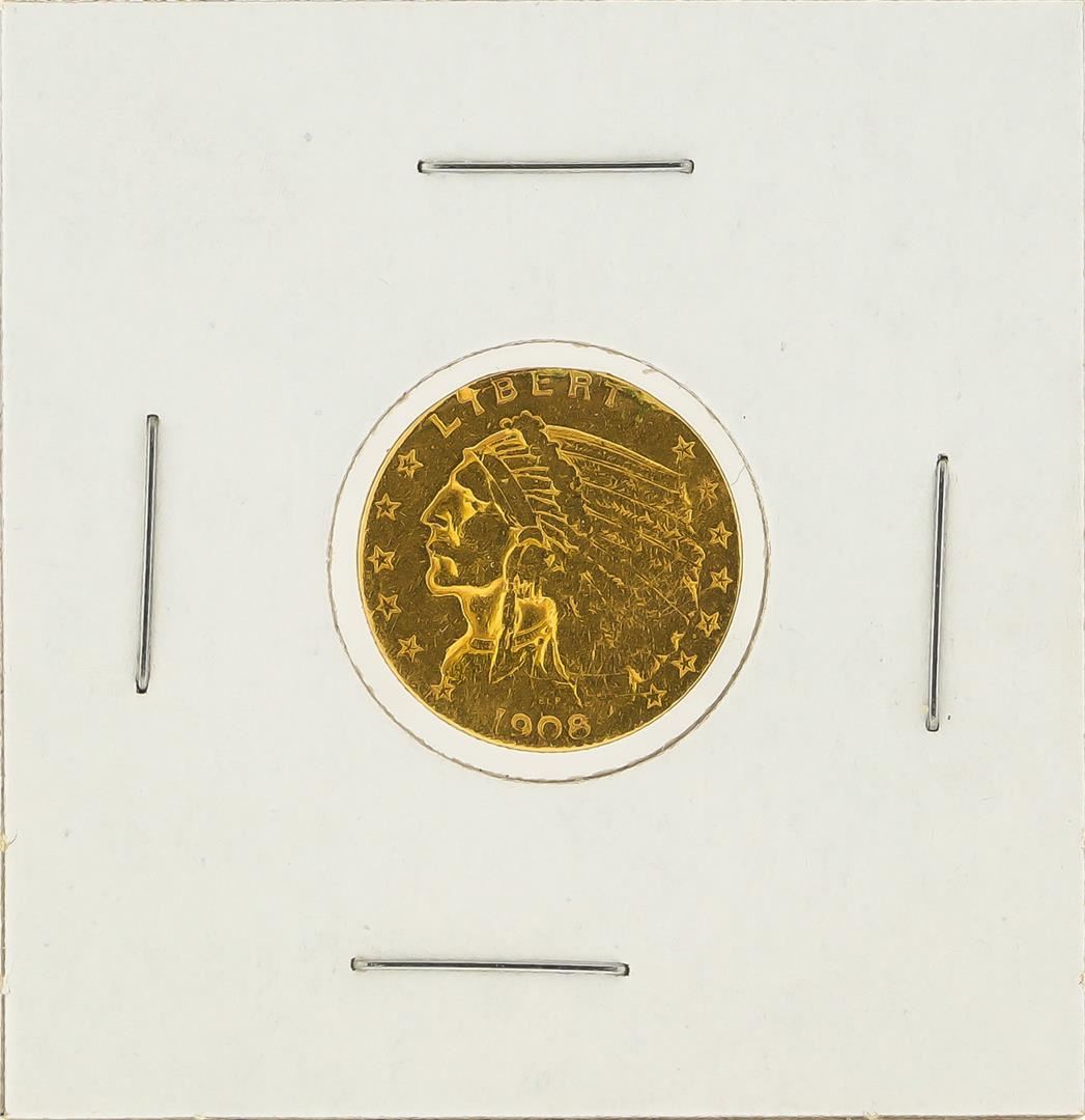 One 1908 $2 1/2 Indian Head Quarter Eagle Gold Coin.