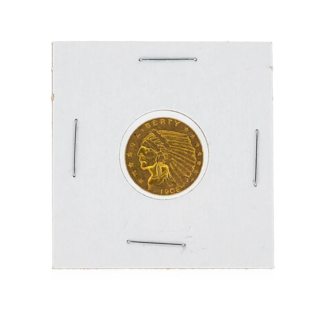 One 1908 $2 1/2 Indian Head Quarter Eagle Gold Coin.