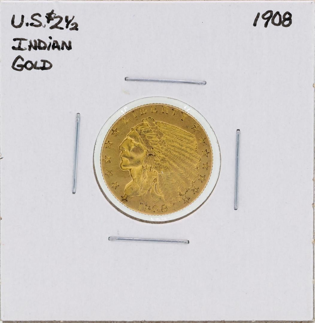 One 1908 $2 1/2 Indian Head Quarter Eagle Gold Coin.