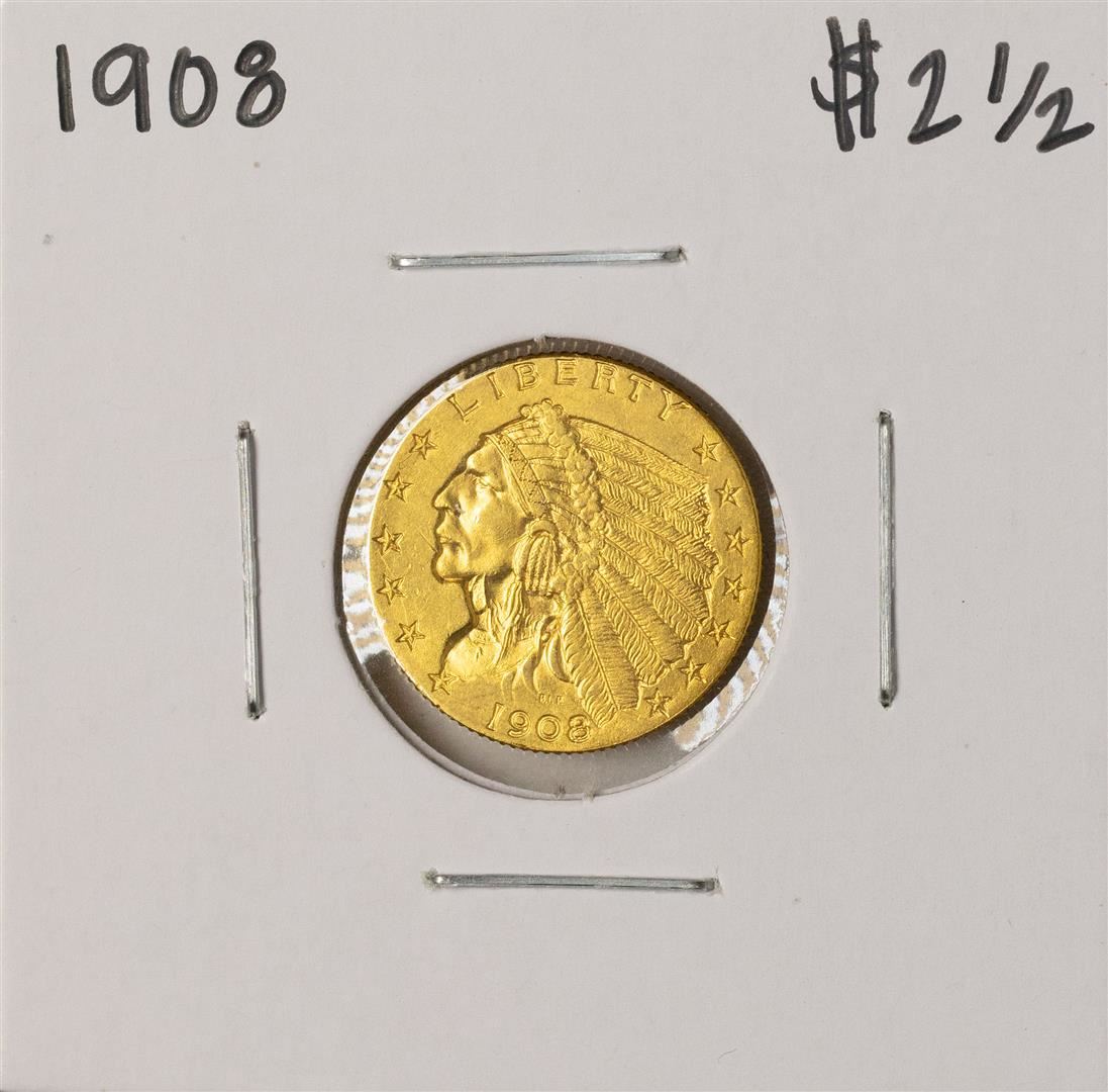 One 1908 $2 1/2 Indian Head Quarter Eagle Gold Coin.