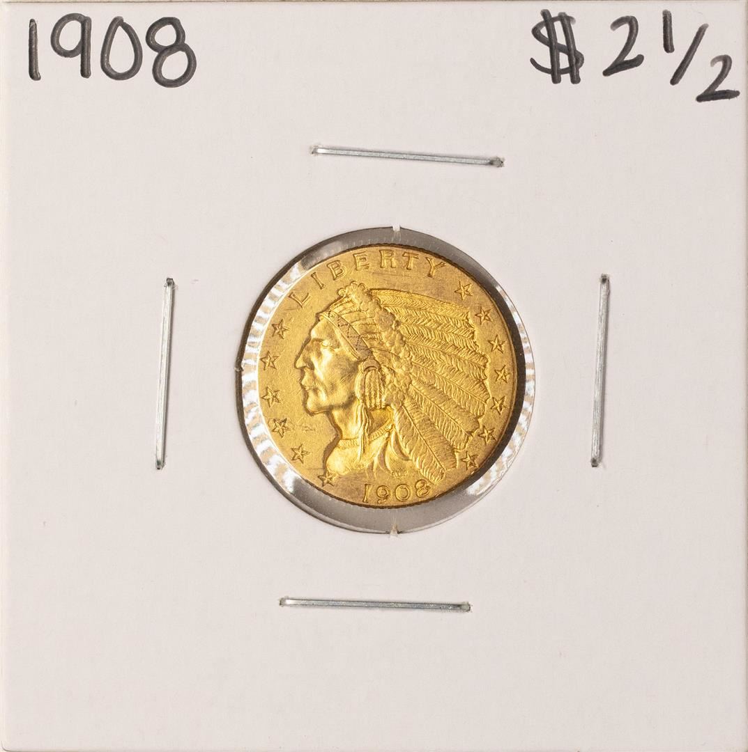 One 1908 $2 1/2 Indian Head Quarter Eagle Gold Coin.
