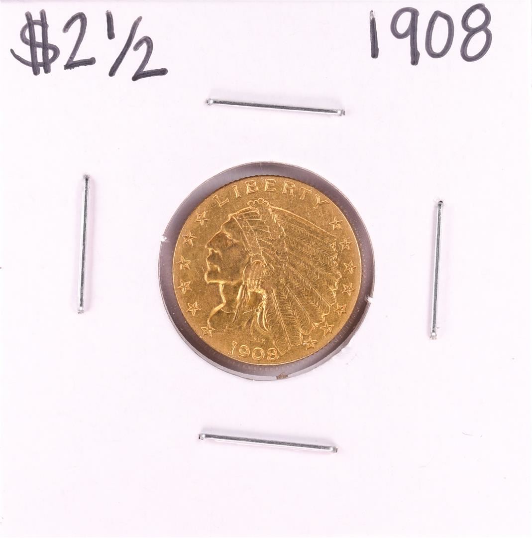 One 1908 $2 1/2 Indian Head Quarter Eagle Gold Coin.