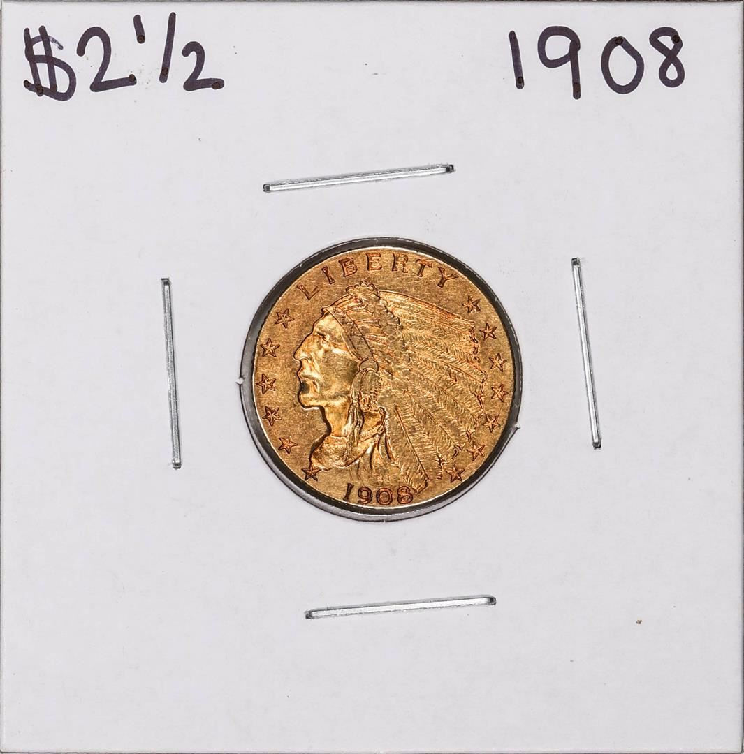 One 1908 $2 1/2 Indian Head Quarter Eagle Gold Coin.