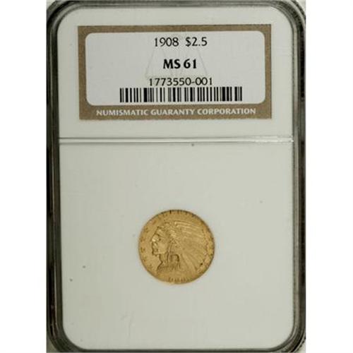 <B>1908 $2 1/2 MS61 NGC.</B></I> NGC Census: (1021/4217). PCGS Population (299/3460). Mintage: 564,800. Numismedia Wsl. Price for NGC/PCGS coin in MS61: $305. (#7939)<BR><BR><b>Shipping:</b> Coins & Currency (<a target="_blank" href="http://www.heritageauctions.com/common/shipping.php">view shipping information</a>)