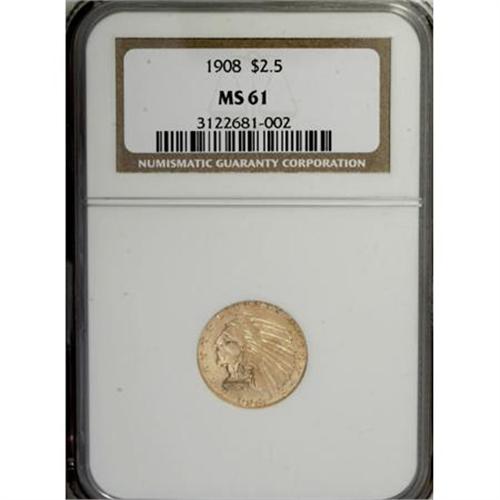 <B>1908 $2 1/2 MS61 NGC.</B></I> . NGC Census: (1097/4490). PCGS Population (312/3727). Mintage: 564,800. Numismedia Wsl. Price for NGC/PCGS coin in MS61: $355. (#7939)<BR><BR><B>Coin Engraver:</B> Bela Lyon Pratt<BR><BR><b>Shipping:</b> Coins & Currency (<a target="_blank" href="http://www.heritageauctions.com/common/shipping.php">view shipping information</a>)