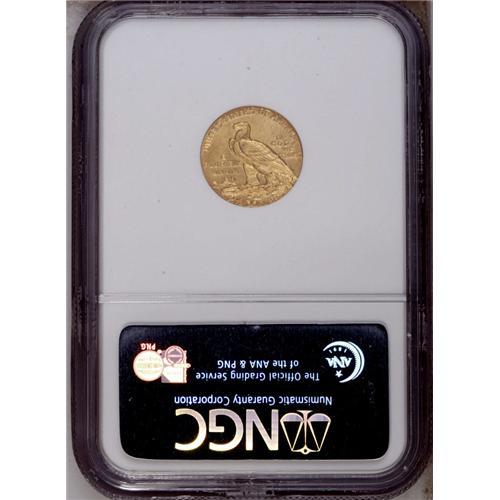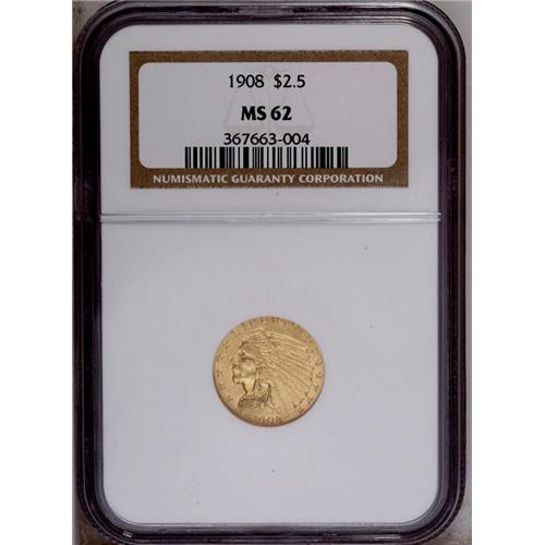 <B>1908 $2 1/2 MS62 NGC.</B></I> Attractive straw-gold color with a few light ticks on the Indian's cheek and on the reverse in the field below S OF. Softly struck on the highpoints, as often seen on this first year of the new Indian Head type.