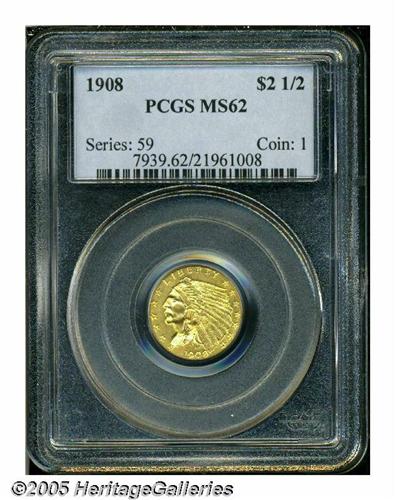 <B>1908<$2 1/2> MS62 PCGS.</B></I> A gorgeous example with brilliant yellow-gold color. Sharply struck and relatively mark free.