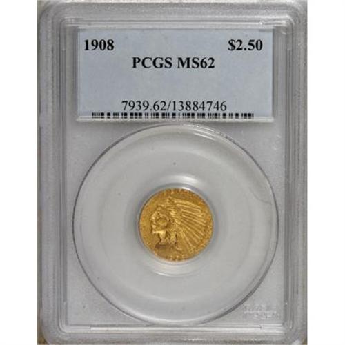 <B>1908 $2 1/2 MS62 PCGS.</B></I> PCGS Population (928/2532). NGC Census: (1875/2359). Mintage: 564,800. Numismedia Wsl. Price for NGC/PCGS coin in MS62: $480. (#7939)<BR><BR><B>Coin Engraver:</B> Bela Lyon Pratt<BR><BR><b>Shipping:</b> Coins & Currency (<a target="_blank" href="http://www.heritageauctions.com/common/shipping.php">view shipping information</a>\)
