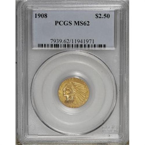 <B>1908 $2 1/2 MS62 PCGS.</B></I> . PCGS Population (987/2761). NGC Census: (1976/2525). Mintage: 564,800. Numismedia Wsl. Price for NGC/PCGS coin in MS62: $500. (#7939)<BR><BR><B>Coin Engraver:</B> Bela Lyon Pratt<BR><BR><b>Shipping:</b> Coins & Currency (<a target="_blank" href="http://www.heritageauctions.com/common/shipping.php">view shipping information</a>)