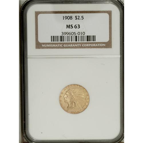 <B>1908<$2 1/2> MS63 NGC.</B></I> Select and lustrous with solidly struck devices. The lemon-yellow devices sport some marks, particularly in the left obverse field, and tiny copper spots appear on the reverse.