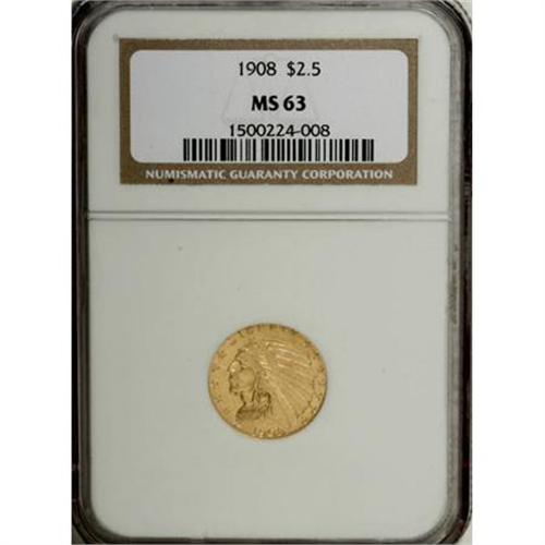 <B>1908 $2 1/2 MS63 NGC.</B></I> NGC Census: (1104/1311). PCGS Population (1080/1529). Mintage: 564,800. Numismedia Wsl. Price for NGC/PCGS coin in MS63: $1,050. (#7939)<BR><BR><B>Coin Engraver:</B> Bela Lyon Pratt<BR><BR><b>Shipping:</b> Coins & Currency (<a target="_blank" href="http://www.heritageauctions.com/common/shipping.php">view shipping information</a>)