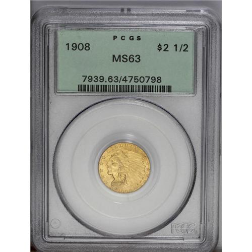 1908 $2 1/2 MS63 PCGS. A lustrous yellow-orange coin,