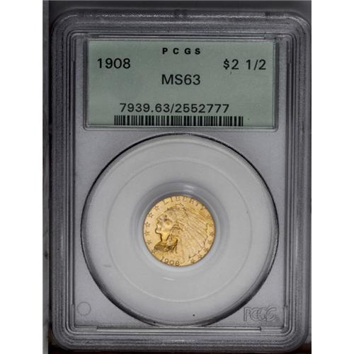 <B>1908<$2 1/2> MS63 PCGS.</B></I> Pleasing champagne-gold and deeper orange-gold toning adorn both sides of this satiny, lustrous example. Boldly struck except for typical weakness on the eagle's shoulder. Wispy luster grazes and pinscratches occur in the fields. <BR><BR><B>Important notice:</B> Heritage usually auctions material at the rate of 200-250 lots per hour. On some occasions eBay Live bid software or the Internet may not be able to keep up with the pace of the auction. We recommend placing a realistic absentee bid now as insurance to avoid disappointment. Occasionally the auctioneer may eliminate or reject an eBay Live bid, and the auctioneer may also reopen a lot after the close of the eBay live bidding (usually because we missed an audience bid), and may reject your bid even if it shows you as the winning bidder. By bidding via eBay Live, you agree that Heritage may award the lot to another bidder at its sole discretion under the circumstances described above or any other reasonable circumstances. Since eBay bids are not shown to us until we open the lot on the floor, we treat those bids just like floor bids. In most cases the floor responds before the eBay bid is presented to us, due to Internet lag time, so for consistency we have made it a policy that floor bids are always considered first over tie eBay live bids. Also please note that all Heritage lots purchased through eBay Live carry a 20% Buyer's Premium. Please make sure you read the Terms and Conditions before you bid. This lot is being auctioned in conjunction with a live floor auction by Heritage Galleries & Auctioneers. All final auction and invoice information will be supplied by Heritage Galleries & Auctioneers, and all other information should be considered preliminary. Lot:2465 <BR><BR><B>Winning Notification and Billing:</B> After the FINAL session in this auction is complete, Heritage will send e-mail and snail mail invoices. This process normally takes several days. All final auction and invoice information will be supplied by Heritage Galleries & Auctioneers, and all other information should be considered preliminary. <BR><BR>This auction will be conducted on a live auction floor and over the Internet through eBay Live. If you choose to place an absentee bid, please take a moment to <font color='#0000ff'><u><a href='http://pages.ebay.com/liveauctions/help/before/laabsentee.html'>learn how eBay Live absentee bidding works</a></u></font><font color='#000000'>