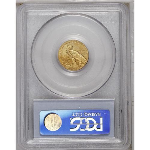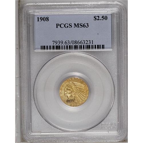 <B>1908<$2 1/2> MS63 PCGS.</B></I> Select with pleasing luster on the straw-gold surfaces. This quarter eagle is intricately detailed with a few scattered marks that restrict the grade.