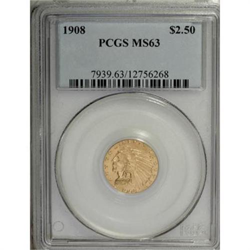 <B>1908 $2 1/2 MS63 PCGS.</B></I> Subtle luster graces the pale straw-gold surfaces of this luminous Select coin. Well-defined with only minor abrasions on the whole, a pleasing example of this first-year issue.<BR><BR><B>Coin Engraver:</B> Bela Lyon Pratt<BR><BR><b>Shipping:</b> Coins & Currency (<a target="_blank" href="http://www.heritageauctions.com/common/shipping.php">view shipping information</a>)