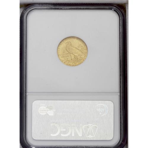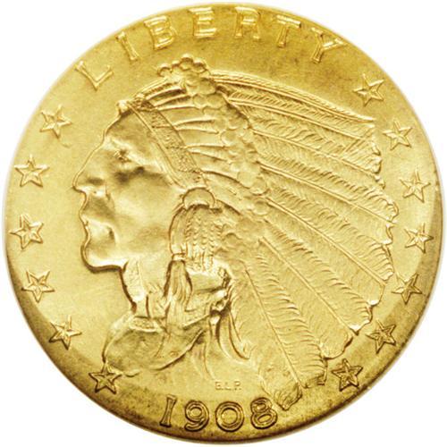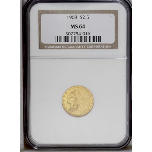 <B>1908<$2 1/2> MS64 NGC.</B></I> A splendid near-Gem with rich and frosty greenish-yellow gold surfaces and subtle orange tendencies. First year of the distinctive design, with the various elements in relief, but sunken below the level of the fields. Only quarter eagles and half eagles struck from 1908 to 1929 utilized this unusual design concept.