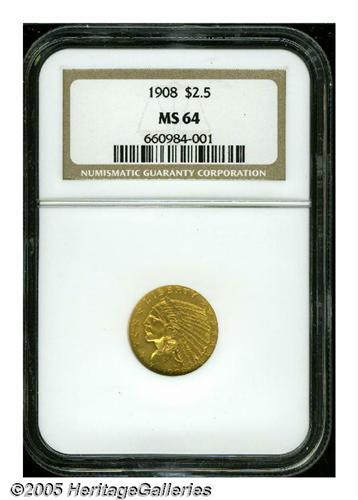 <B>1908<$2 1/2> MS64 NGC.</B></I> Fully lustrous and essentially brilliant with just a hint of olive iridescence, something that attests to the originality of this lovely example. Coined during the first year of the design type.