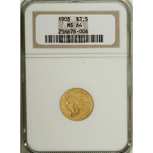 <B>1908 $2 1/2 MS64 NGC.</B></I> Fully struck on the obverse with the usual lack of definition at the top of the eagle's wing. Satiny and problem-free with loads of eye appeal.<BR><BR><b>Shipping:</b> Coins & Currency (<a target="_blank" href="http://www.heritageauctions.com/common/shipping.php">view shipping information</a>)