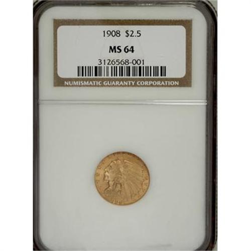<B>1908 $2 1/2 MS64 NGC.</B></I> This sharply struck and somewhat matte-like near-Gem has medium green-gold toning and a gorgeously preserved obverse. The reverse shows only a couple of faint luster grazes.<BR><BR><B>Coin Engraver:</B> Bela Lyon Pratt<BR><BR><b>Shipping:</b> Coins & Currency (<a target="_blank" href="http://www.heritageauctions.com/common/shipping.php">view shipping information</a>)