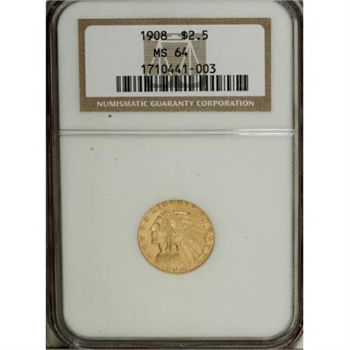 <B>1908 $2 1/2 MS64 NGC.</B></I> A well struck and attractive lemon-gold near-Gem, minimally marked on the obverse. Though a few light abrasions are present on the reverse, this coin displays beautifully.<BR><BR><B>Coin Engraver:</B> Bela Lyon Pratt<BR><BR><b>Shipping:</b> Coins & Currency (<a target="_blank" href="http://www.heritageauctions.com/common/shipping.php">view shipping information</a>)