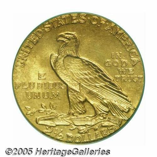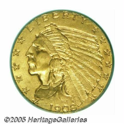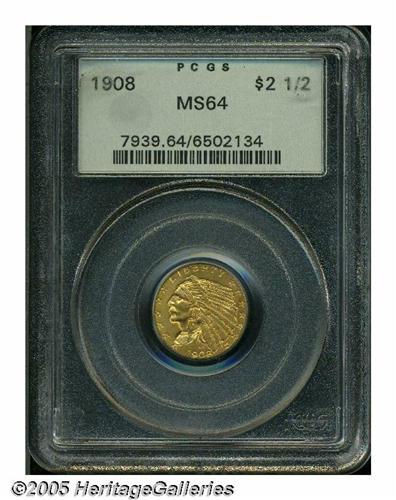 <B>1908<$2 1/2> MS64 PCGS.</B></I> A lovely lustrous example coined during the first year of the Indian Head design by Bela Lyon Pratt. Essentially brilliant surfaces with some splashes of pale lilac on the obverse. Most design features are sharp. Here is a perennial favorite with collectors who specialize in 20th-century gold coins.