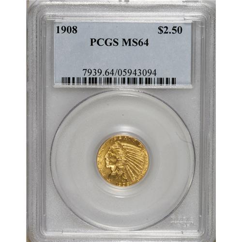 <B>1908 $2 1/2 MS64 PCGS.</B></I> A luminous Choice gold type coin with an even strike and only a couple of minor field marks. The new reverse design for the half eagle resembled the 1908 Motto ten dollar reverse, except the legends E PLURIBUS UNUM and IN GOD WE TRUST switched places.<BR><BR><b>Shipping:</b> Coins & Currency (<a target="_blank" href="http://www.heritageauctions.com/common/shipping.php">view shipping information</a>)