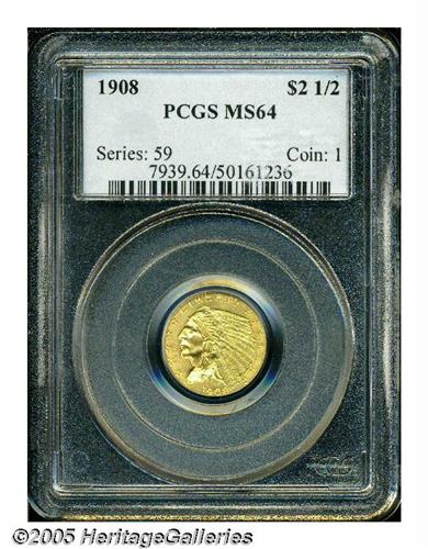 <B>1908<$2 1/2> MS64 PCGS.</B></I> Boldly struck, except on the eagle's shoulder, with satiny, smooth, evenly toned surfaces that seem abrasion-free. An attractive, well preserved near-Gem.