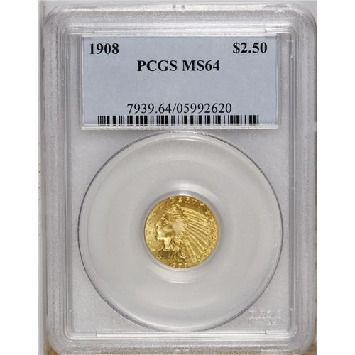 <B>1908 $2 1/2 MS64 PCGS.</B></I> Bright luster emanates from brassy-gold surfaces that are quite well preserved. Except for weakness on the eagle's shoulder, the design elements are sharply struck.<BR><BR><b>Shipping:</b> Coin/Currency (<a target="_blank" href="http://www.heritageauctions.com/common/shipping.php">view shipping information</a>)
