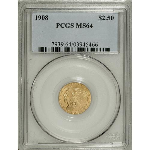 <B>1908 $2 1/2 MS64 PCGS.</B></I> Bright, yellow-gold color and highly lustrous. Softly struck at the top of the eagle's wing, as always seen on this year.<BR><BR><b>Shipping:</b> Coins & Currency (<a target="_blank" href="http://www.heritageauctions.com/common/shipping.php">view shipping information</a>)