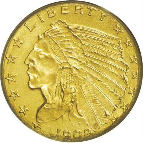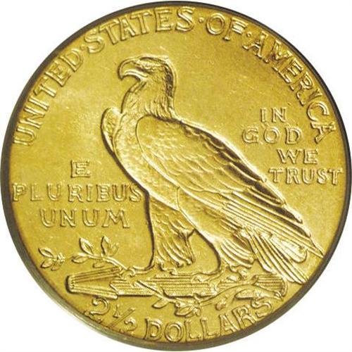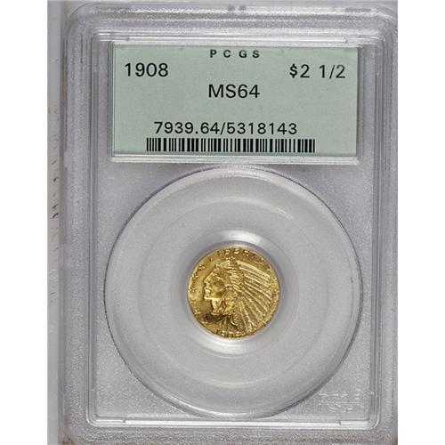 <B>1908<$2 1/2> MS64 PCGS.</B></I> From the debut year of Pratt's innovative design comes this Choice example. The lustrous lemon-yellow surfaces pale somewhat at the lower right obverse, though the coin's sheen does not dim. The sharply struck devices display hardly any marks, though the fields show some abrasions that contribute to the grade. Housed in a green label holder.