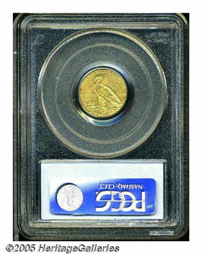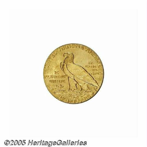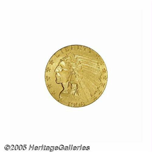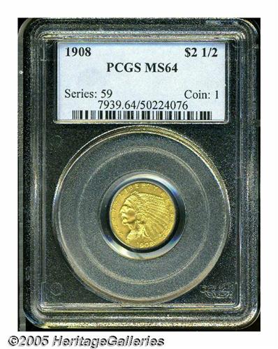 <B>1908<$2 1/2> MS64 PCGS.</B></I> It is quite unusual to find an Indian Quarter Eagle with such clean surfaces. Normally these coins are extensively abraded because of the incused relief design, they show the slightest contact because the highest portions of the design are level with the raised fields. This is a lovely, near-gem coin that has excellent mint luster and some olive-golden patina. A popular coin because of the first-year status of the date.