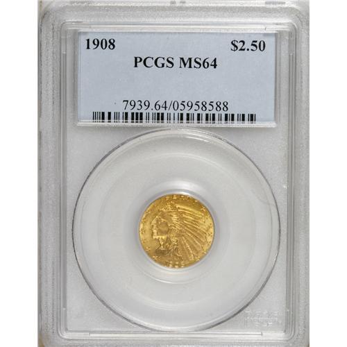 <B>1908 $2 1/2 MS64 PCGS.</B></I> Lemon-gold and aqua-green embrace this smooth and shimmering near-Gem. A boldly struck and radiant example from the introductory year of the type.<BR><BR><b>Shipping:</b> Coins & Currency (<a target="_blank" href="http://www.heritageauctions.com/common/shipping.php">view shipping information</a>)