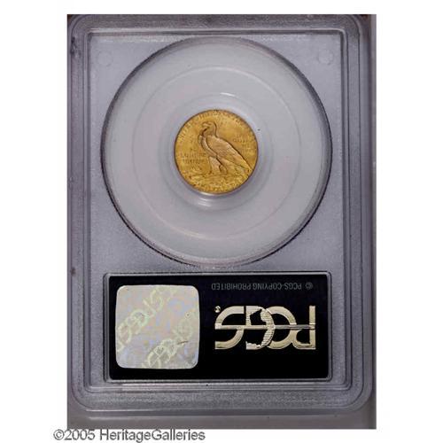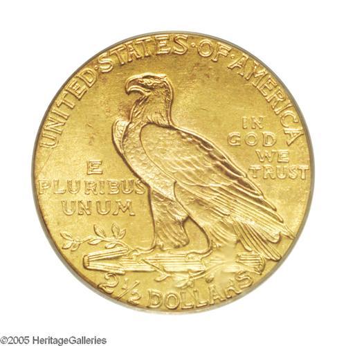 <B>1908<$2 1/2> MS64 PCGS.</B></I> Sharply struck, with a couple of shades of lovely peach-gold toning featuring pale green undertones. A few trivial marks in the reverse fields limit the grade to MS64. First year of issue and a popular coin as such.