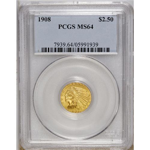 <B>1908 $2 1/2 MS64 PCGS.</B></I> The design elements are solidly struck, save for softness on the eagle's shoulder. Peach-gold color enlivens highly lustrous surfaces that are nicely preserved.<BR><BR><b>Shipping:</b> Coin/Currency (<a target="_blank" href="http://www.heritageauctions.com/common/shipping.php">view shipping information</a>)