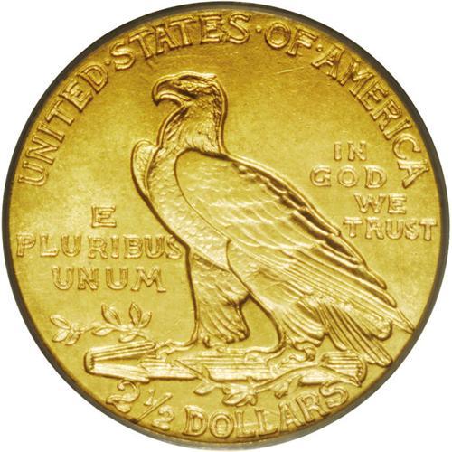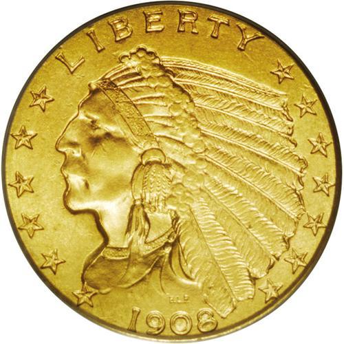 <B>1908<$2 1/2> MS64 PCGS.</B></I> The obverse is crisply detailed with uniform khaki-golden coloration while normal striking deficiency on the eagle's forewing seems to preclude a possible Gem rating.