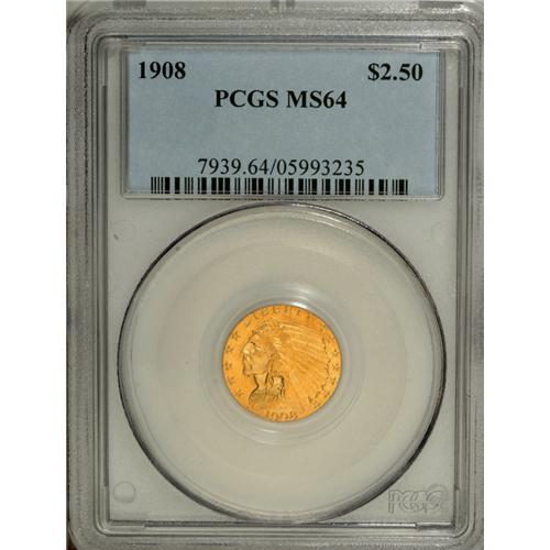 <B>1908 $2 1/2 MS64 PCGS.</B></I> This Choice and pleasing yellow-gold example displays strong luster. The obverse periphery and upper eagle's wing exhibit slight striking weakness.<BR><BR><b>Shipping:</b> Coin/Currency (<a target="_blank" href="http://www.heritageauctions.com/common/shipping.php">view shipping information</a>)